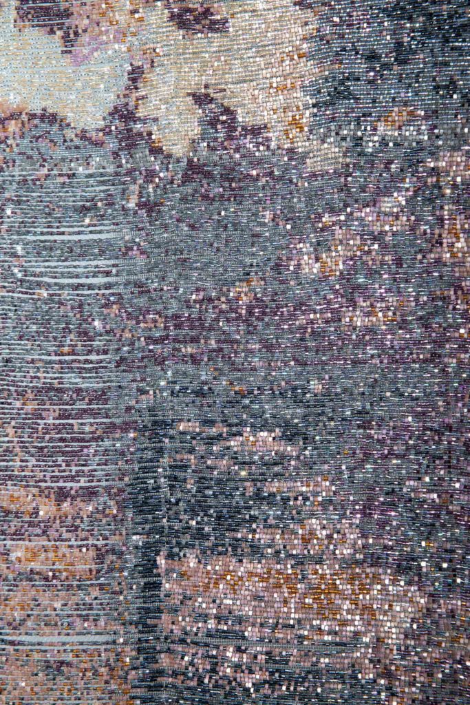 This series explores the contemporary urge to escape the modern world into archetypal landscapes — spaces recalling the cave’s refuge and a longing to reconnect with nature and cyclical time. Embroidery with seed beads becomes a tactile extension of photography: the digital image is slowly transformed through a precise, repetitive process, decomposing bead by bead until it disintegrates.