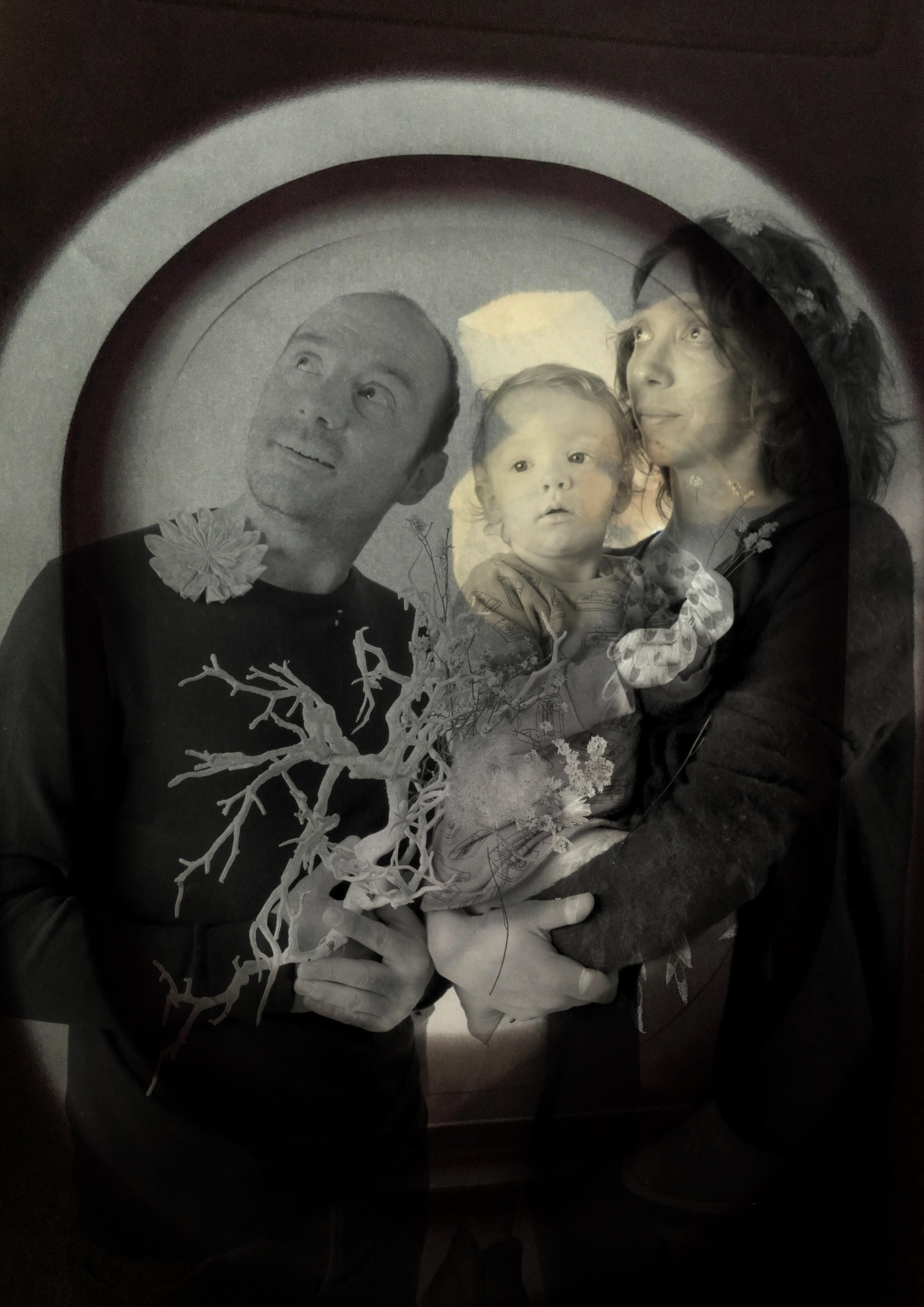 Let ghostly animals pass through you, let extraordinary flowers grow inside your body, or immerse yourself in glaciers… A hymn to the wild inhabitants of the world, the photographer’s photo studio will transform you into fish-women, parrot-men, child-flamingos… Families are invited to pose with accessories. The photographer reworks portraits using layers to create landscape portraits, in the world of her photographs produced on tracing paper and reworked with drypoint techniques.