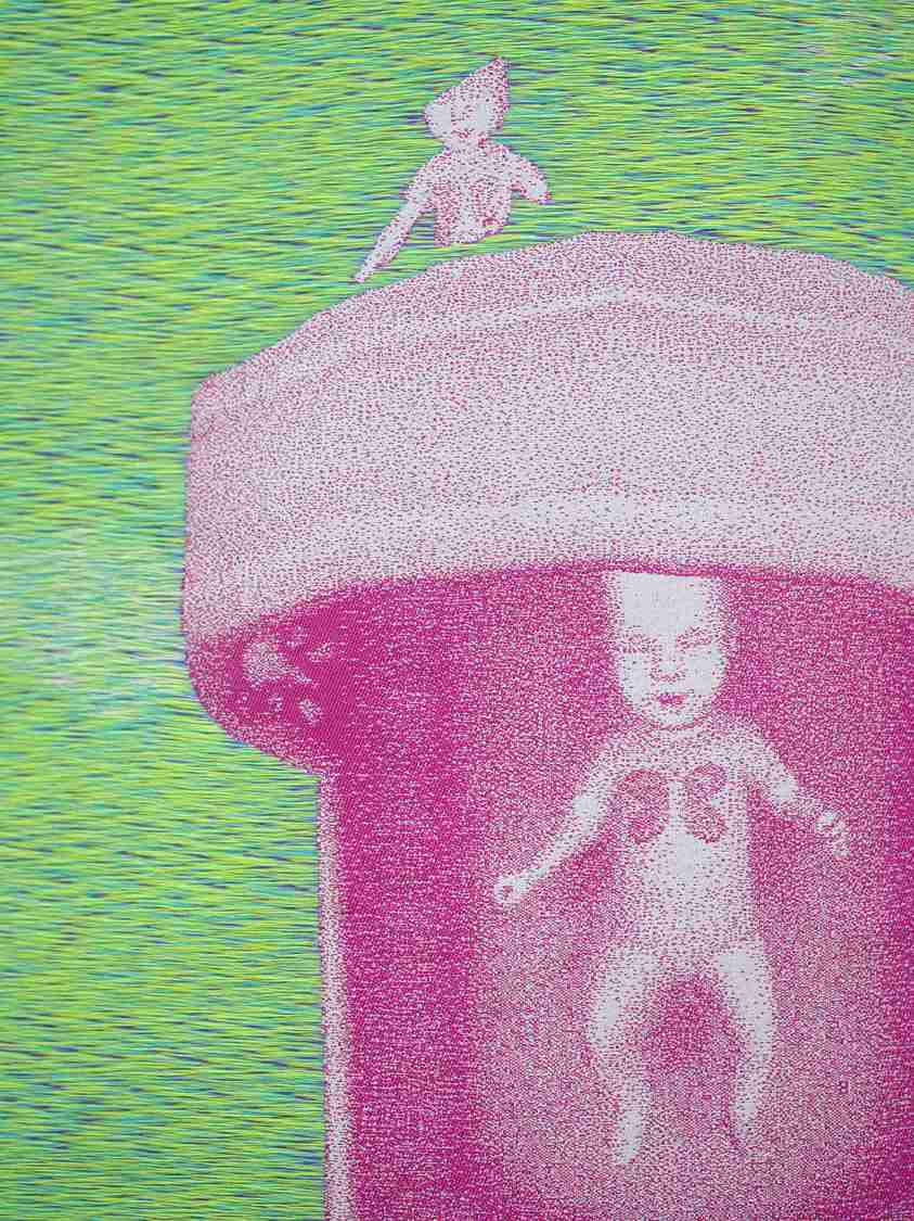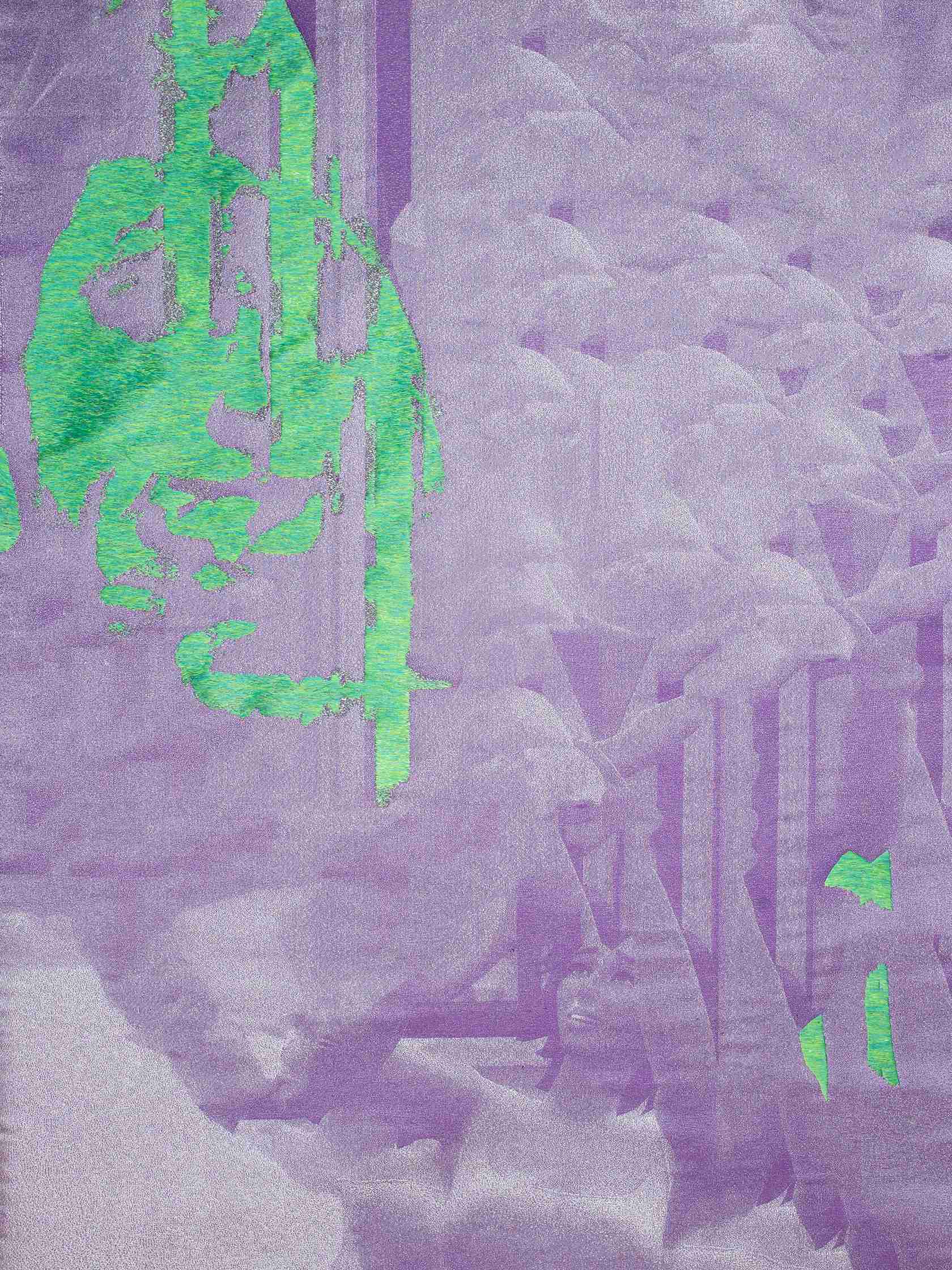 La série The Reality Check explore les effets des injonctions sociales sur les femmes, et particulièrement le désir de devenir mère, à travers la photographie. Pour l’artiste, ce désir remonte à son enfance, lorsqu’elle passait des heures à jouer aux Sims et à construire virtuellement sa vision de la famille idéale. En utilisant le jeu vidéo comme décor de scènes domestiques, Nina Pacherová révèle l’ambivalence des relations amoureuses à la fois comme refuge et comme piège, comme stabilité et comme chaos. Ce sentiment se matérialise en artefacts : des tapisseries, réalisées avec l’artiste Karolina Tomasewska sur un métier Jacquard numérique, où se mêlent glitch et matière textile. L’oeuvre oscille ainsi entre plusieurs points de vue – femme, enfant, player et personnage –, et interroge les rôles assignés et la manière dont nos imaginaires se construisent à travers les images et les technologies.