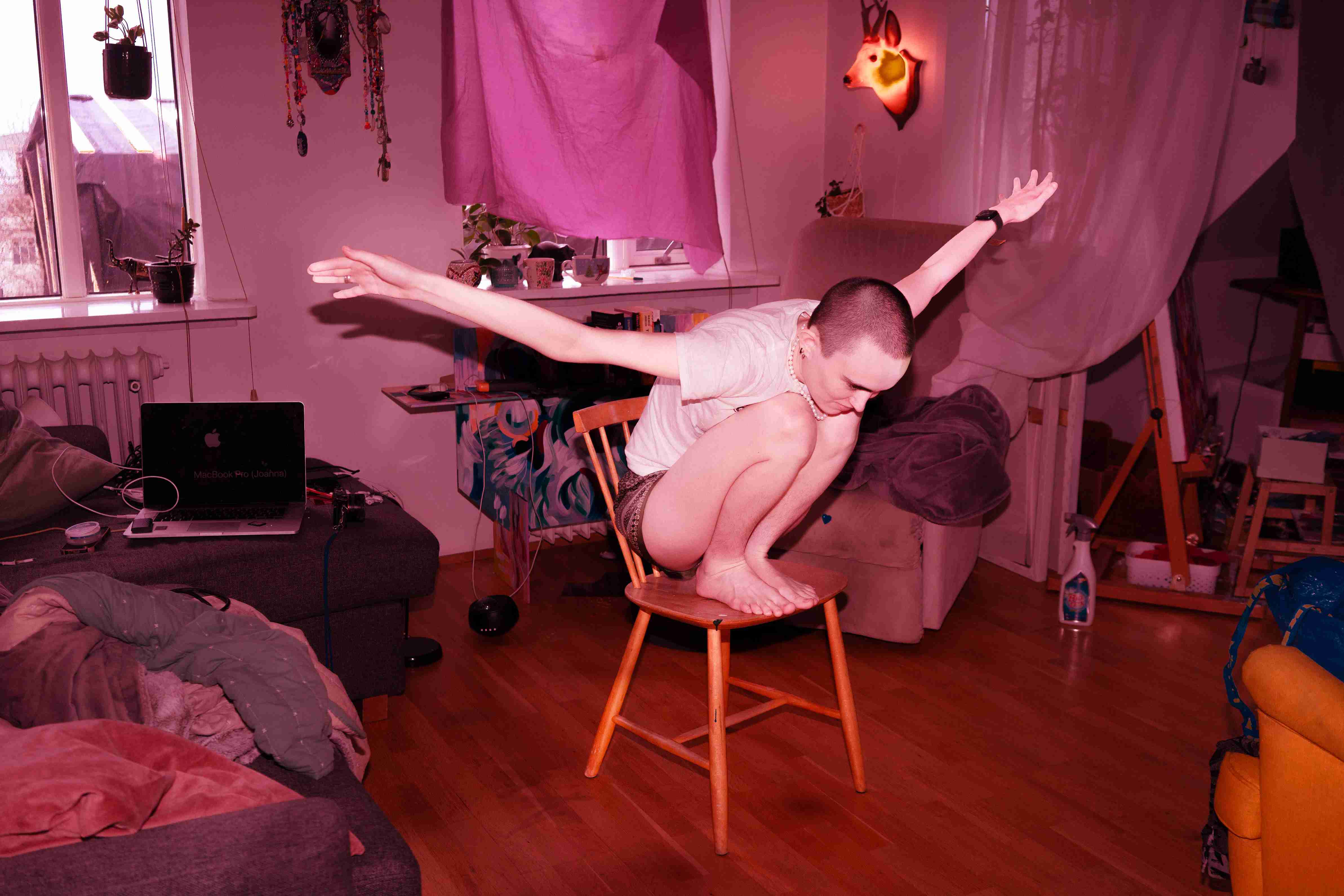 Everything I Want to Tell You naît de dialogues entre les deux artistes sur la manière dont leurs corps et leurs vies sont impactés par la classe sociale, la maladie, l’immigration, le genre et la sexualité. Pour échapper aux définitions qui leur sont assignées, le duo investit l’image comme un lieu partagé, à la fois trace du vécu et espace de projection. Le projet mêle documentation de leurs trajectoires parallèles à travers captures d’écran, photographies et fragments vidéo, et mises en scène communes de fantasmes et de mondes désirés. Chaque image explore les limites du corps en tant que surfaces formant un ensemble en mouvement où s’inscrivent fatigue, désir et vulnérabilité. L’installation s’articule autour de la tension entre binarités — stabilité/précarité, dedans/dehors, flotter/chuter, envelopper/dépouiller — et invite le public à entrer dans l’esprit des artistes au moment qui précède l’endormissement, quand souvenirs anciens, sensations du jour et projections mentales se superposent avec la même intensité.