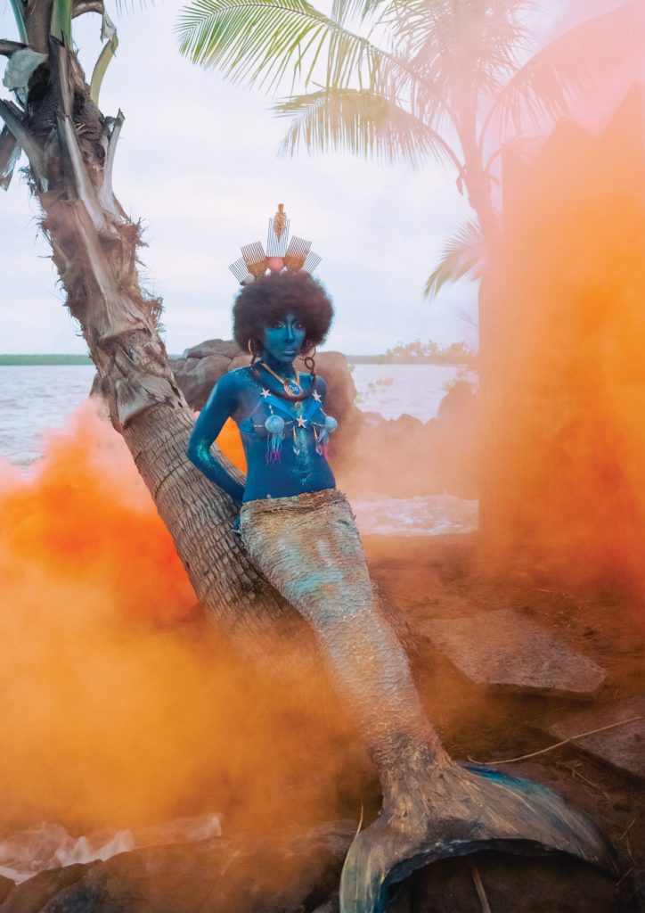 Manman dilo, mère des eaux, figure mythique mi-femme mi-poisson partagée par les peuples de Guyane, incarne la puissance naturelle et l’esprit des eaux, à la fois redoutée et vénérée. Les artistes s’appuient sur le toponyme « Guyane », qui signifie en langues arawak et wayana « Terre d’eau abondante », pour imaginer un monde où l’eau est omniprésente.