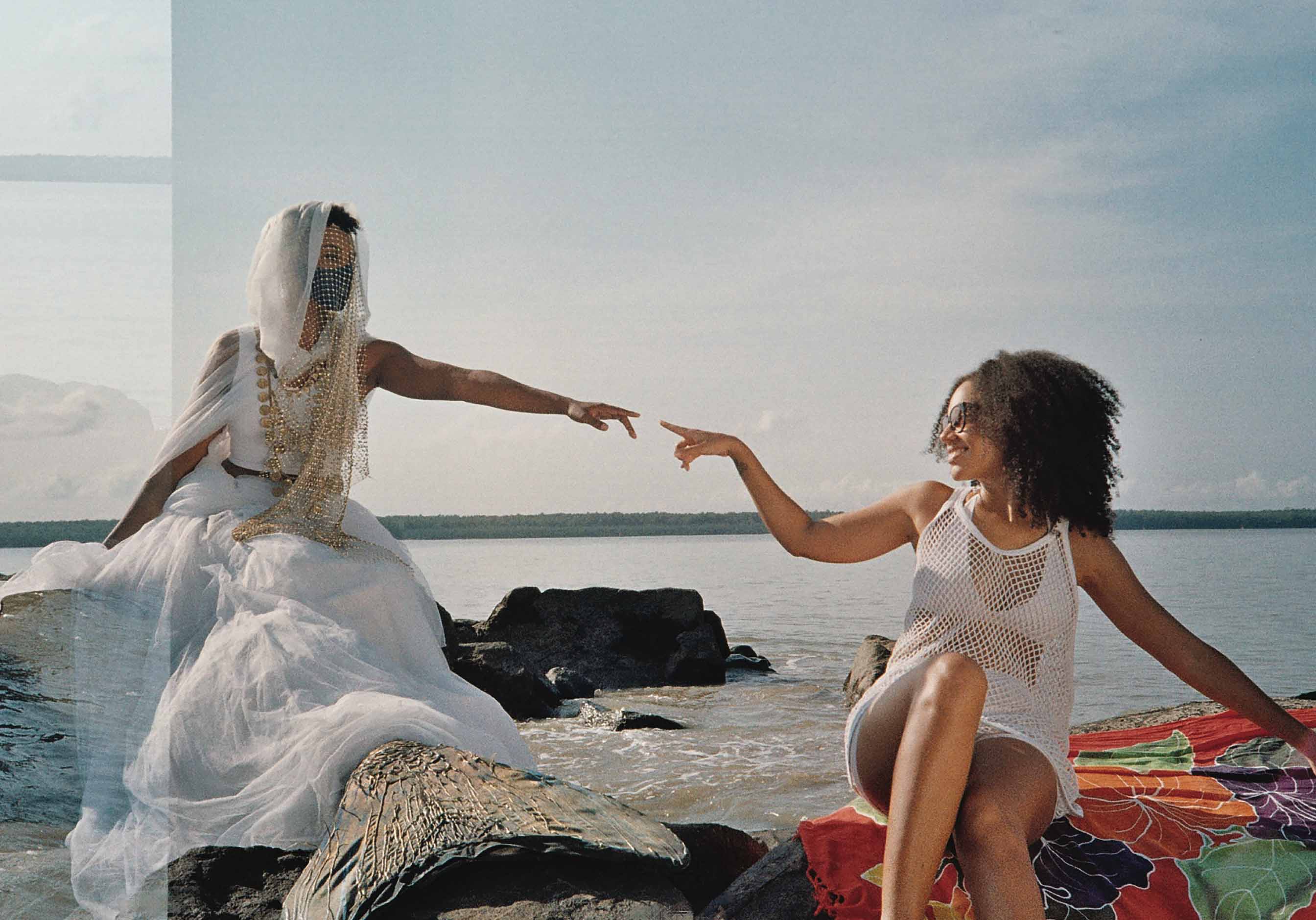 Manman Dilo, mère des eaux, figure mystique mi-femme mi-poisson partagée par les peuples de Guyane, incarne la puissance naturelle et l’esprit des eaux, à la fois redoutée et vénérée. T2i et Noun s’appuient sur le toponyme « Guyane », qui signifie en langues Arawak et Wayana « Terre d’eau abondante », pour imaginer un monde où l’eau est omniprésente. Ensemble, iels élaborent une iconographie afrofuturiste autour de ce mythe amazonien encore peu représenté dans l’espace public. Dans une dystopie environnementale où Manman Dilo reprend possession des lieux et des objets du monde moderne, elle devient témoin des dégradations infligées aux eaux. Les artistes interrogent ainsi cette figure comme gardienne des mémoires et des oralités afrodescendantes, mais aussi comme force féminine souveraine.